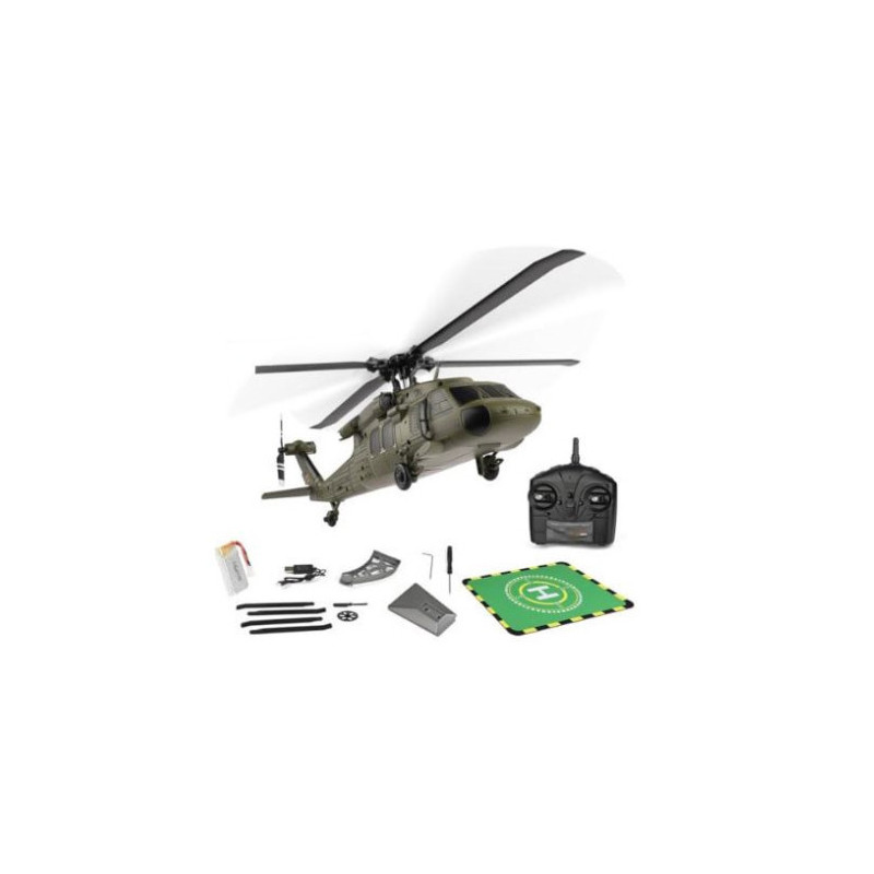 The WLtoys XK K170 UH-60L Black Hawk is a 4-channel flybarless brushless RC helicopter with 6-axis gyro and altitude hold, supplied RTF with 2.4GHz radio, a 3.7V 800mAh LiPo battery and USB charger, giving around 8 minutes of stable flight per pack and a realistic military green Black Hawk scale body for beginners and experienced pilots who want a compact but capable electric heli.