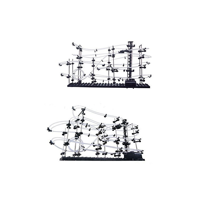 The SpaceRail Level 3 Marble Roller Coaster Construction Set is a more advanced construction toy that allows users to build a large, multi section marble roller coaster using rails, supports and connectors. Once assembled, steel balls roll through the track using gravity, then are lifted back to the start by a motorised elevator to create a continuous running loop.